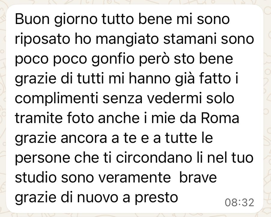 Ho messo due impianti nel loro studio il trattamento e stato indolore e efficiente inoltre il dottore e gli assistenti ti mettono a tuo agio e sono molto attenti e scrupolosi si sono anche fatti sentire telefonicamente giorni successivi sull’ andamento dell' intervento.